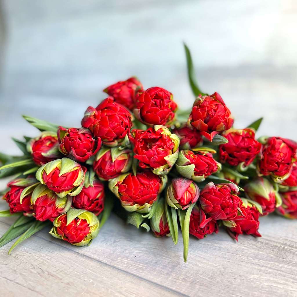 Nuestros tulipanes blancos dobles son así de espectaculares. Su color es rojo intenso como el labial clásico rojo. No usamos programas como Photoshop para mostrar un ramo distinto al que te llegará realmente.